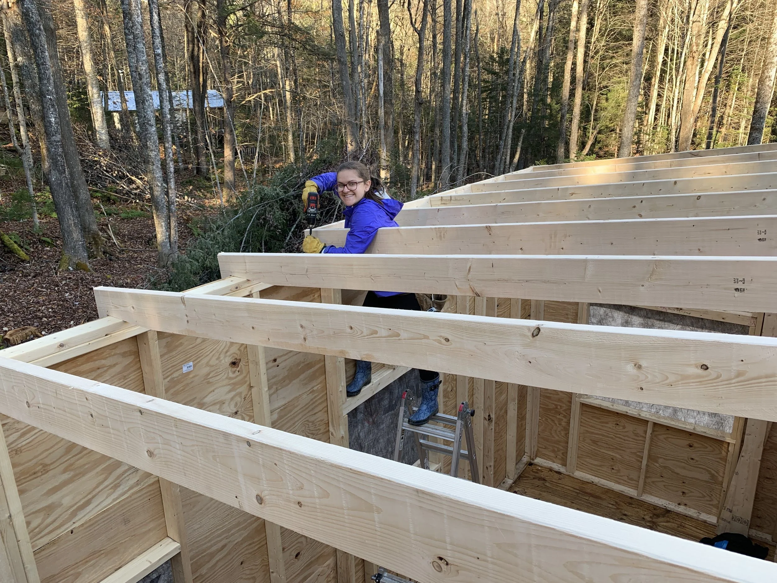 Common tasks include raising the walls, exterior painting, screwing down the sheathing, installing rigid foam insulation panels, paneling the interior walls, and staining the interior woodwork. Dress for the weather and bring a drill, impact driver, tape measure, tool belt, and paint brush if you have them.